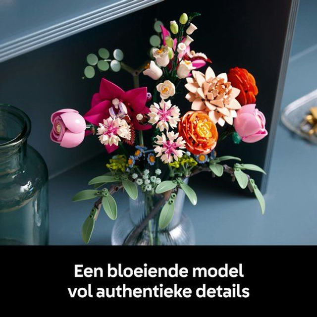 Beginnende bloemisten kunnen zich ontspannen en tot rust komen terwijl ze het LEGO boeket bouwen dat bestaat uit 15 LEGO bloemenstelen, waaronder madeliefjes, korenbloemen, eucalyptus, vlierbloesems, rozen, ranonkels, orchideeën, een waterleliedahlia en een campanula. Alle stelen zijn verstelbaar om bouwers aan te moedigen een persoonlijk LEGO bloemenboeket samen te stellen dat ze kunnen gebruiken als woonaccessoire of decoratie voor op kantoor. De bloemen kunnen ook worden gecombineerd met andere LEGO boeketten (apart verkrijgbaar) om een groter, uniek bloemendisplay te creëren.